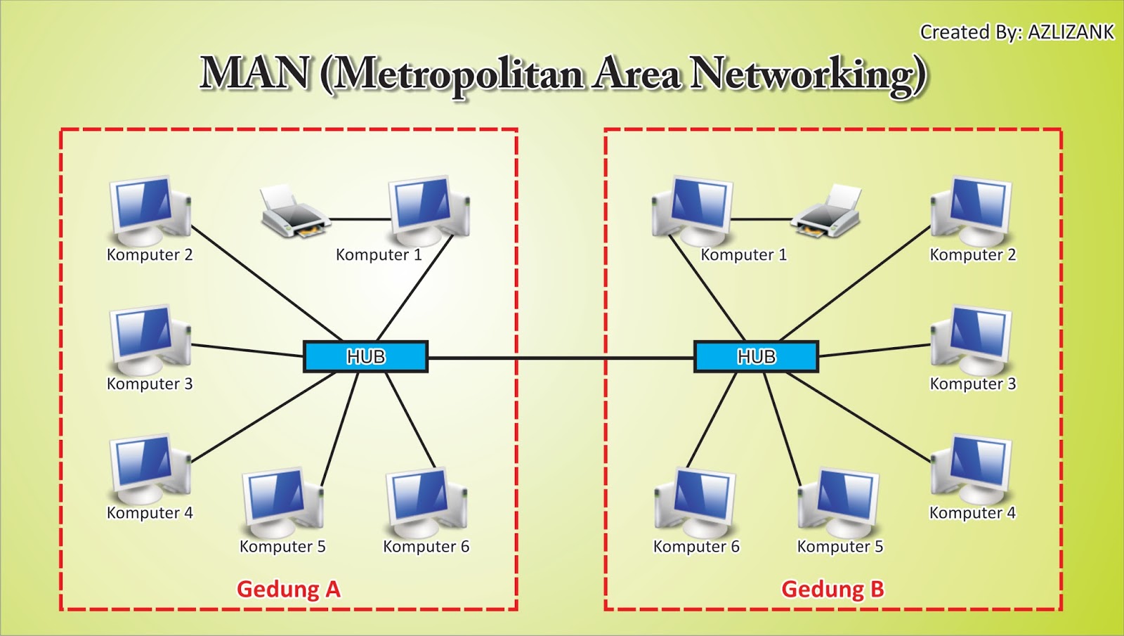 Contoh : Komputer komputer yang saling terhubung di sekolah, perusahaan, warnet maupun antar rumah tetangga yang masih mencakup satu wilayah LAN.